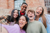 A cheerful group of friends enjoying their time together, taking a spontaneous selfie to cherish their joyful moments, laughter, and camaraderie, highlighting the essence of friendship and youth.