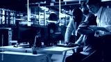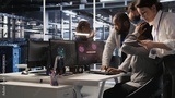 Scared data center technicians reacting to virus warning on PC display, scrambling to launch emergency response protocol. Admins run around server room, urgently trying to fix hacked systems, camera A