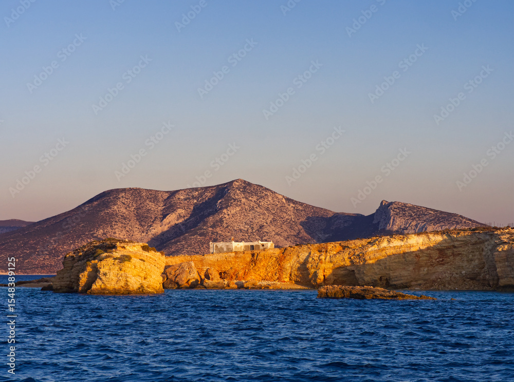 Rocky coastal cliffs at sunset in Koufonisi island Aegean