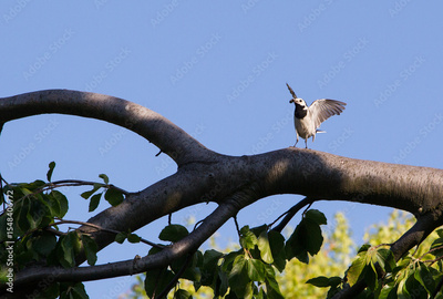 Ptak pliszka szara z robakiem w dziobie na gałęzi drzewa