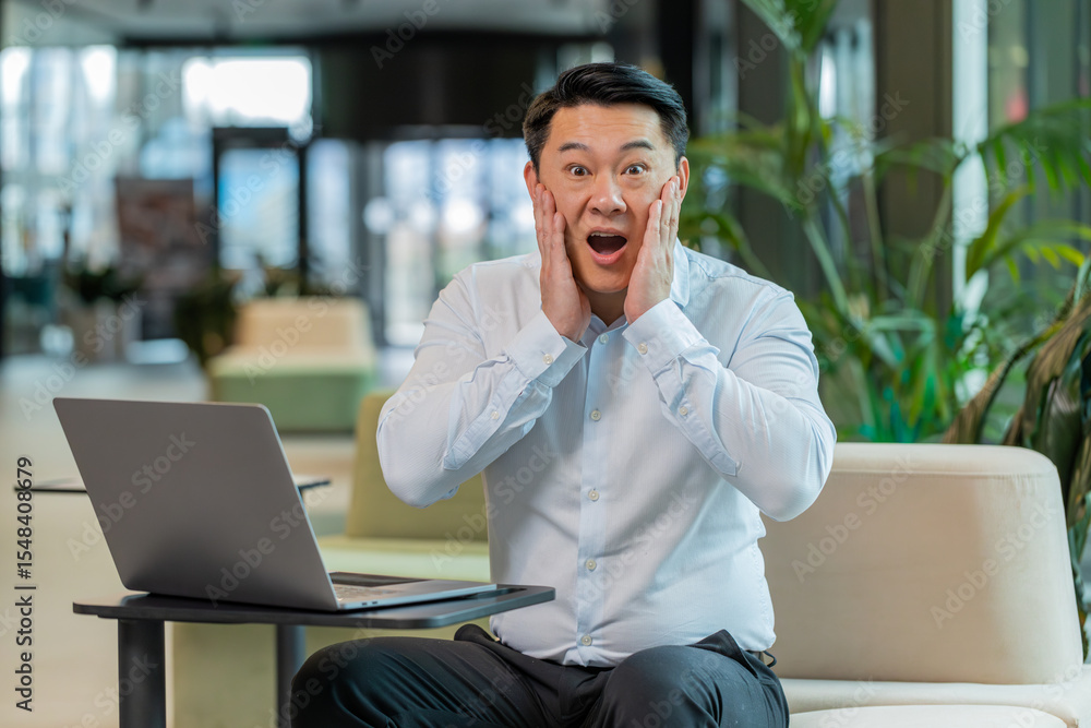 Oh my God, Wow. Closeup of Chinese businessman looking at camera shocked by sudden victory game winning, lottery goal achievement, good news. Professional manager guy in shirt sitting in office lobby.