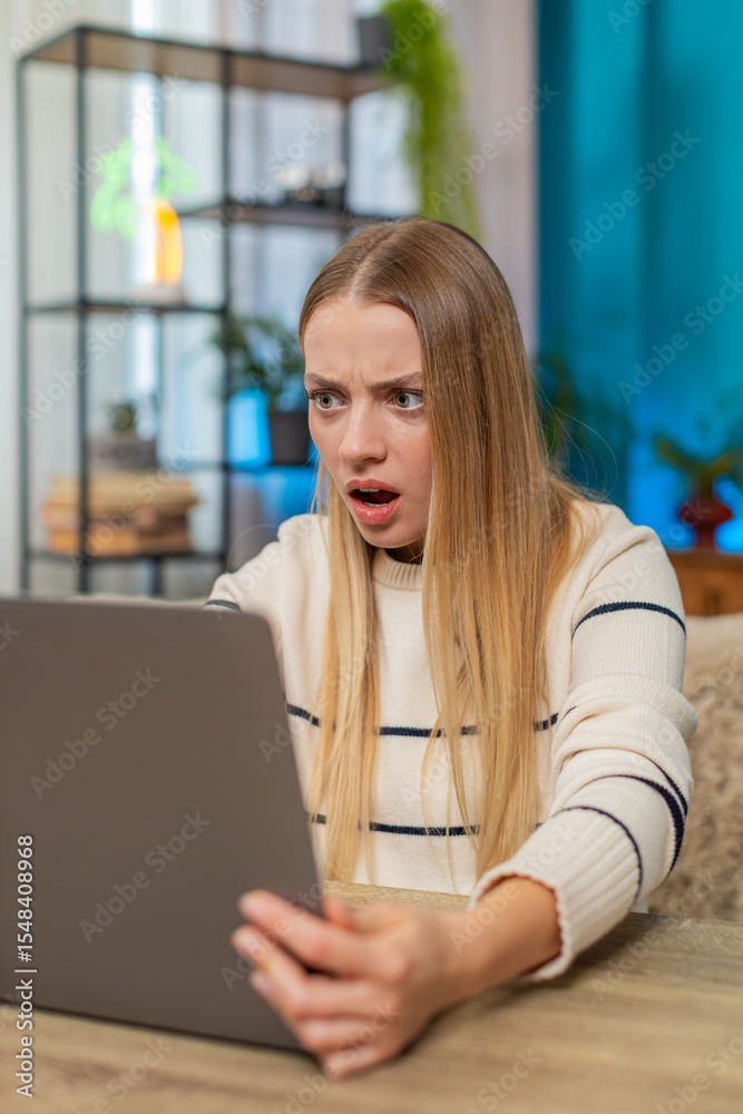 Caucasian woman at home on table working on laptop, virus error, lost data, screen, tapping keys, feeling anxious, desperate, needing fix. Girl appears confused, frustrated, holding head, seeking help