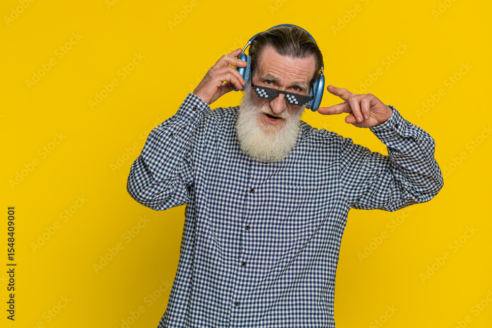 Excited senior stylish old man listening music via headphones and dancing disco party fooling around having fun expressive gesticulating hands. Happy mature grandfather pensioner on yellow background
