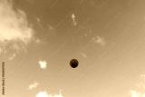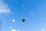 basketball thrown outdoors with blue sky and clouds