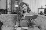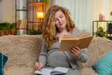 Pregnant young woman writes notes from parenting book at home, concentrating with serious expression, preparing for future motherhood. Girl thoughtfully records ideas, embracing learning and care.