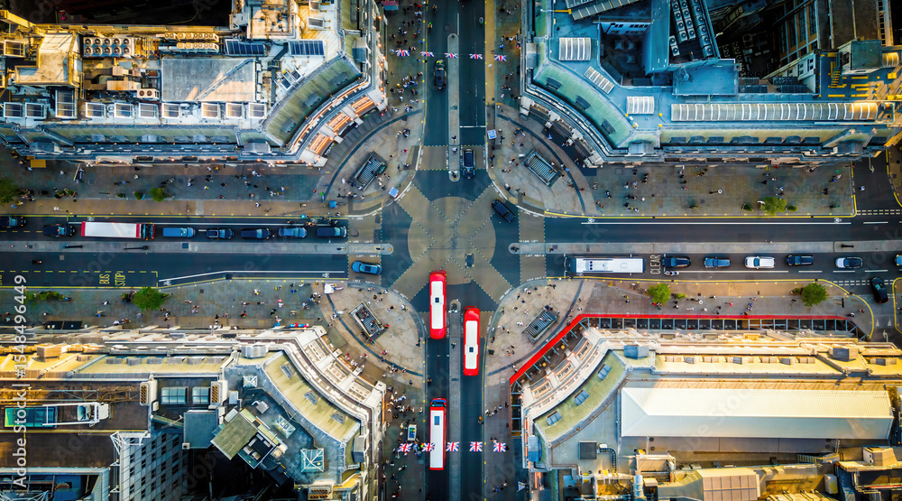 Aerial view of Oxford Circus in London with busy streets, iconic architecture, and red double-decker buses on a clear, sunny day