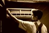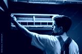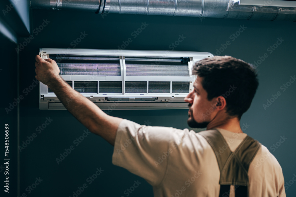 Technician installs air conditioning unit in modern indoor space during warm afternoon