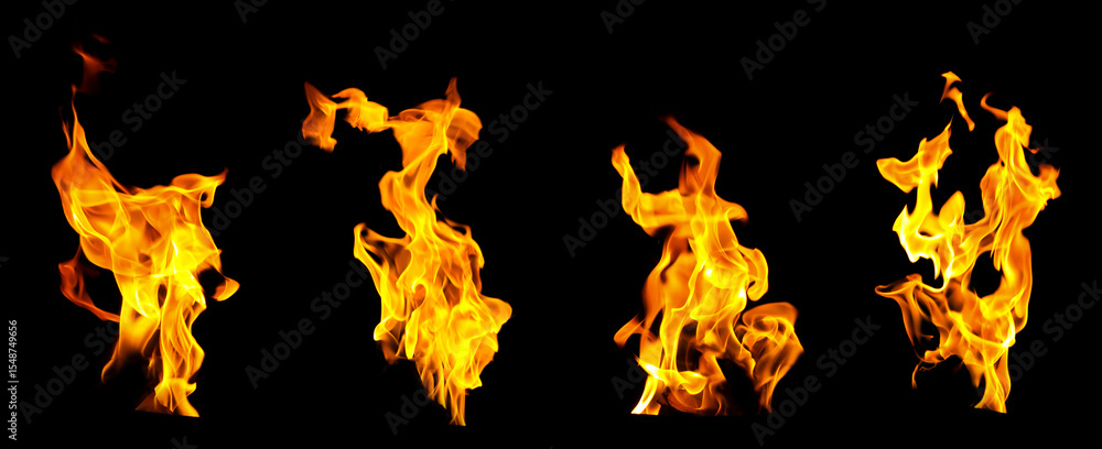 Isolated abstract flames collection on black background. Flames on black background. Concept of burning effect texture. Graphic design. Bonfire. Flames at night. Flame effect with burning fire.