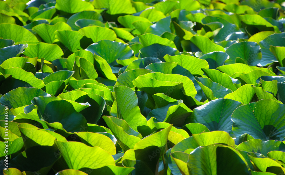 夏の朝陽に輝く北海道庁前の睡蓮の葉 / Water Lily Leaves in Front of the Hokkaido Government Office Glistening in the Summer Morning Sun