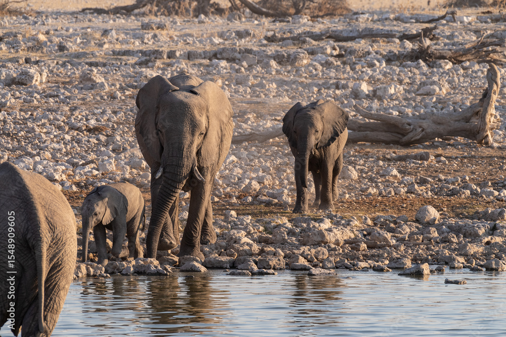 A herd of African Elephant -Loxodonta Africana- taking a bath in a waterhole in Etosha national Park.