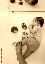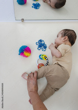 Pediatric physical therapy. Therapist guides toddler through rollover technique in physical therapy session