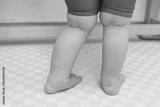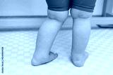 A child with valgus deformity of feet and hypermobile joints of foot stands in rehabilitation center, close-up. Treatment of foot deformity