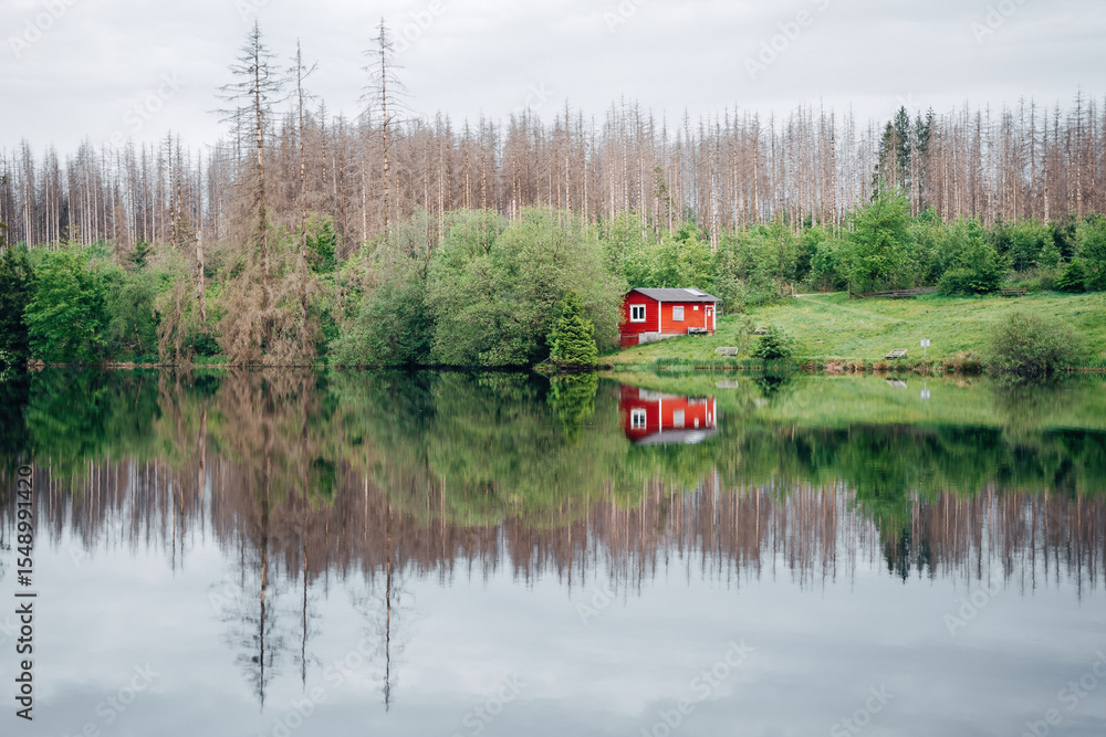 Serene Solitude - A House Embraced by Mist on a Tranquil Lakeside Morning