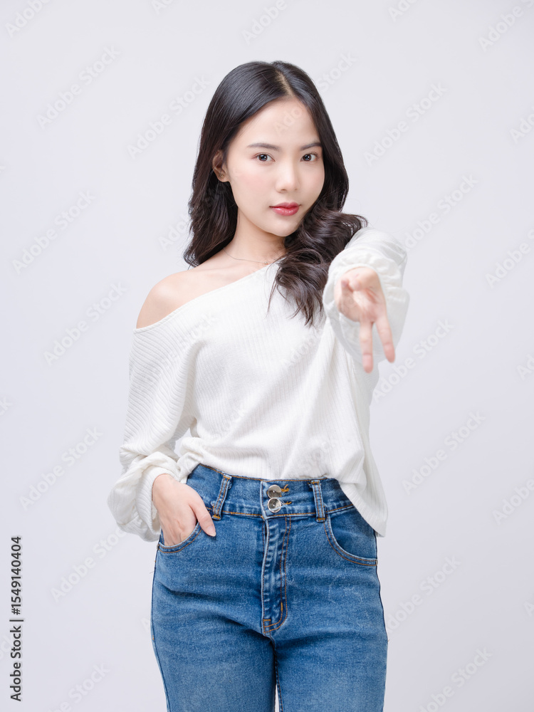 Half body portrait happy smile young asian beautiful woman curly hair wearing long sleeve shirt, blue jeans outfit, casual standing pose on white background joy positivity fashion lifestyle concept.