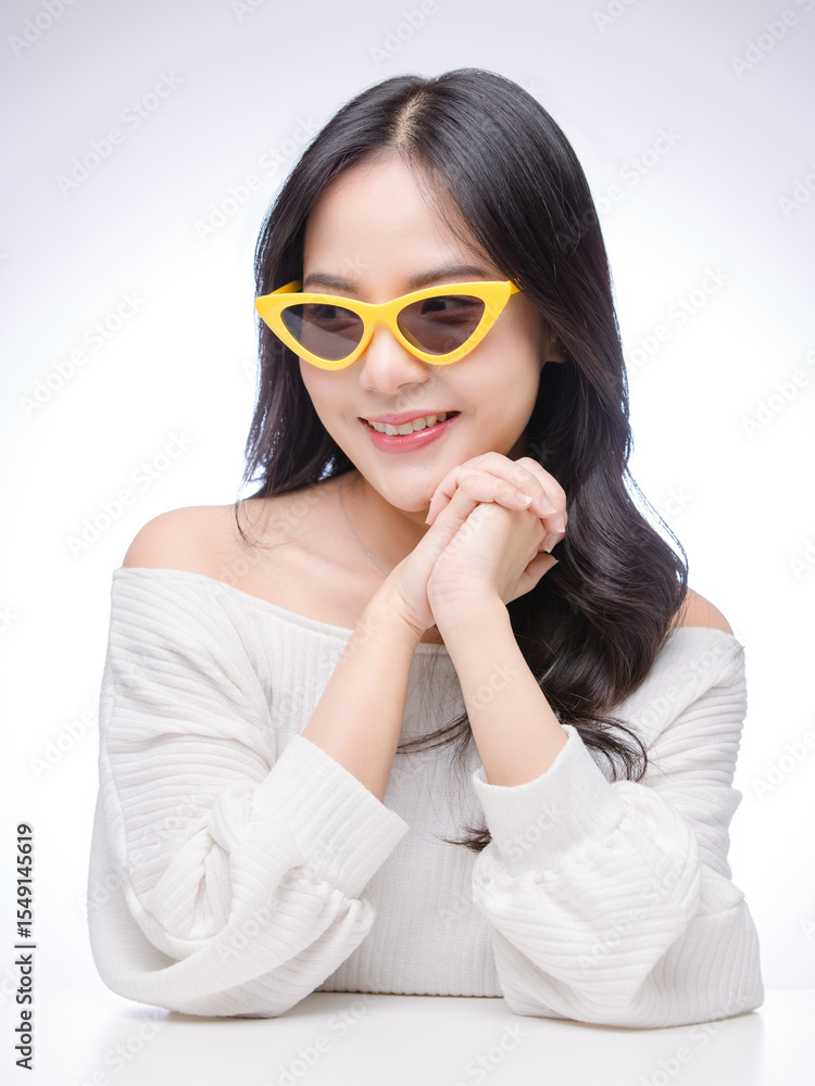 Asian young beautiful attractive cute happy woman long black hair poses with smile cheerful expression, wearing white sweater yellow sunglasses fashion, sitting white table against light background.