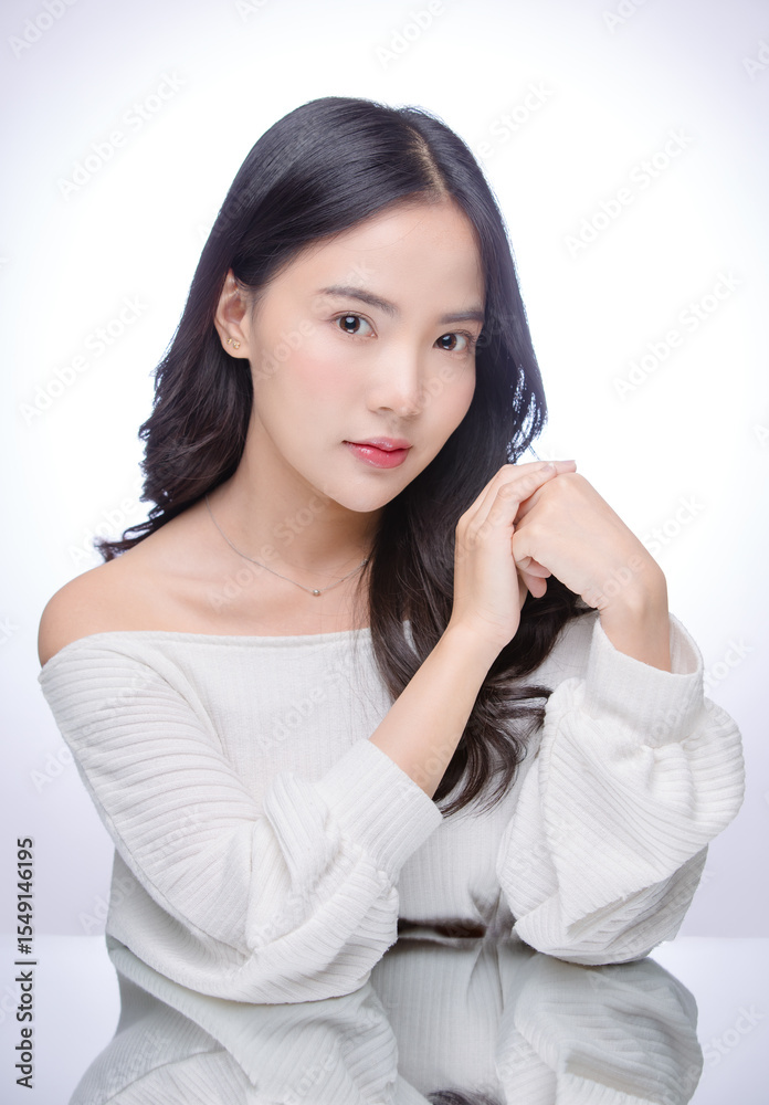 Portrait happy cheerful young asian beautiful woman clean fresh skin, showcasing healthy and wellness smile look at camera on white background Ideal facial skincare glowing beauty treatment promotions