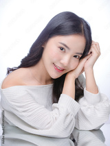 Portrait happy cheerful young asian beautiful woman clean fresh skin, showcasing healthy and wellness smile look at camera on white background Ideal facial skincare glowing beauty treatment promotions
