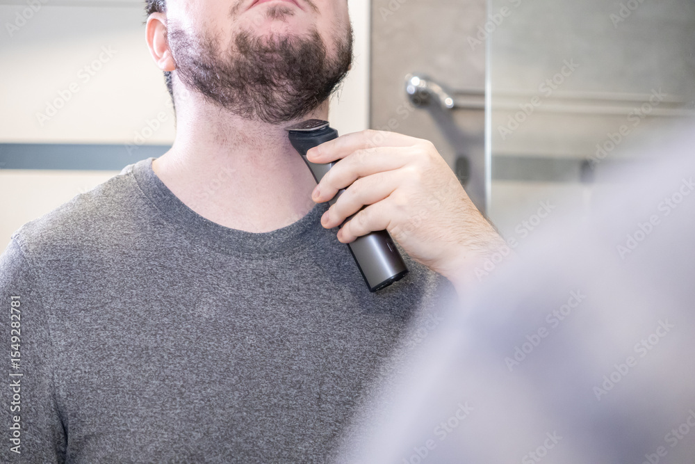 Close up of a man trimming his beard with an electric shaver, reflecting modern male self-care and daily grooming for personal hygiene
