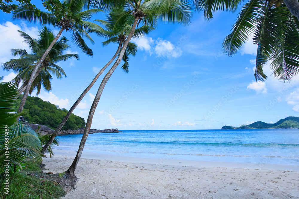 Beautiful white sandy beach, turquoise water and coconut palm trees at anse takamaka, Mahe Seychelles