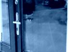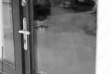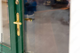 Golden door handle on green frame with glass reflection, ideal for design elements, access visuals, and architectural or security themed content.