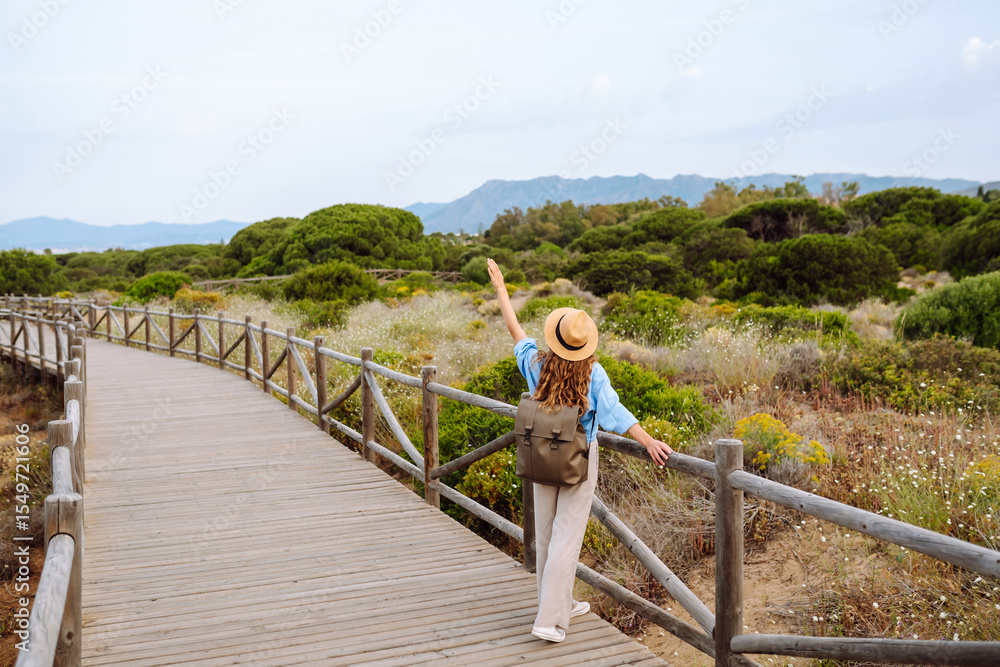 Beautiful woman in hat and backpack walking on wooden walking path enjoying seascape. Young tourist feeling enjoyment in nature. Travel and vacation concept. Active lifestyle.