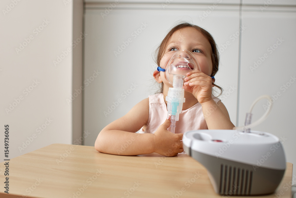 cute little toddler girl inhaling medicine on nebulizer and holding it on her own