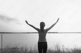 woman with open arms at river and sunshine