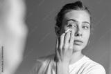 Close-up of young woman's face wiping her face with white cotton pad while looking in the mirror. Young woman enjoys reflection and touches face in cozy room. Beauty and naturalness concept.