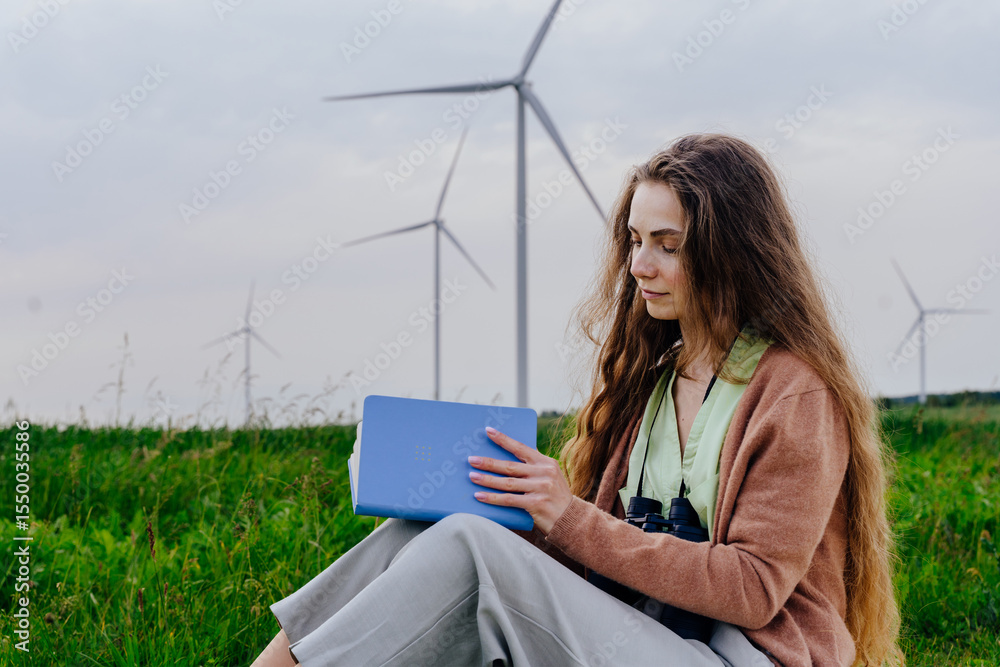 Woman with binoculars reading notebook near wind turbines