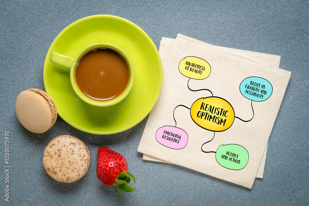 Realistic optimism is the mindset that combines a hopeful outlook with an honest assessment of reality. Infographics mind map.