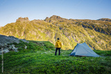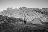 Hiker enjoying view from camping spot in mountains. Backpacker standing at tent during long trekking in European Alps. Hiking and outdoors active lifestyle