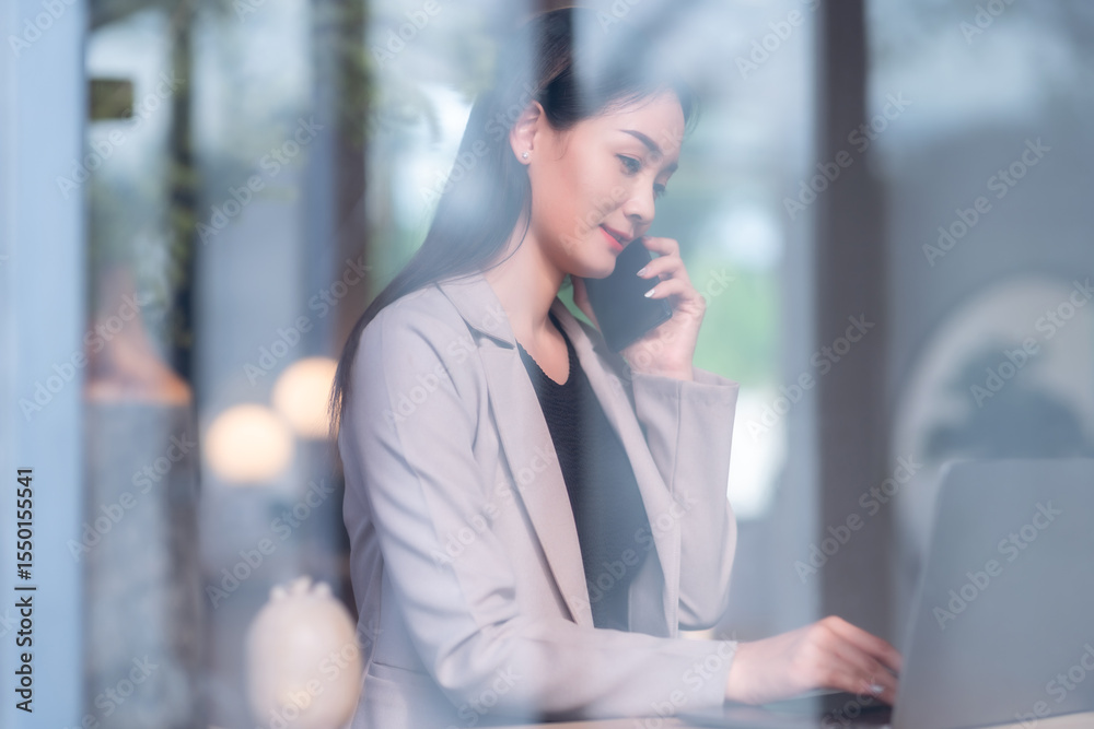asian freelance people Beautiful business female talking making using casual working with laptop computer for browsing internet, chatting and blogging and smartphone,notebook in coffee shop.