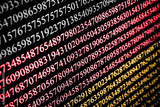 Germany data flow concept. Numbers forming German flag. Hacking theme in black red yellow. Cyber background for data breach or internet threat. Symbolic tech transfer image.