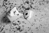Broken yellow cup with smiley face and spilled black tea on the floor. Tea spilled on the floor. Splashes and tea leaves on the floor.