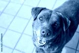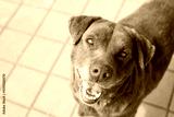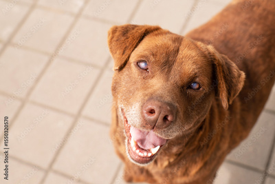 Portrait of cute happy red street dog with poor eyesight outdoors on a sunny day, soft focus.