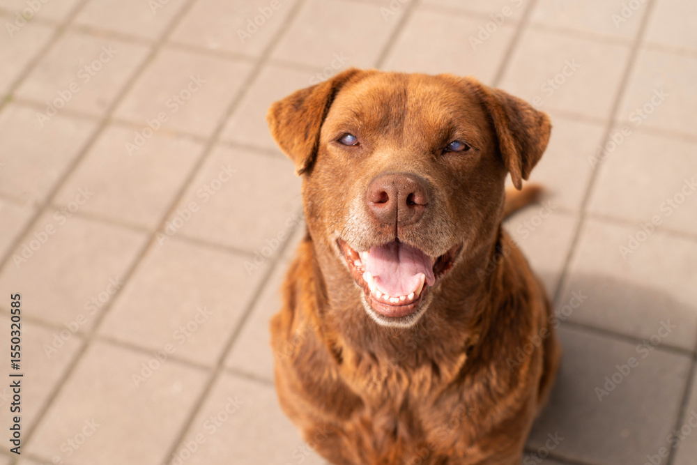 Portrait of cute happy red street dog with poor eyesight outdoors on a sunny day, soft focus.