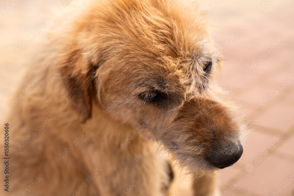Portrait of cute brown street dog on sunny day, soft focus, close up. Homeless animals on the streets of the city