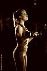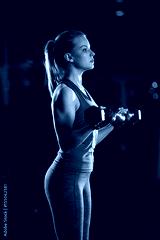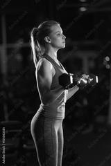 Beautiful sporty woman doing power fitness exercise at sport gym. Girl with dumbbell on black.