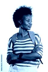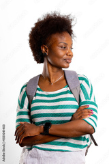 Black woman with her arms crossed, serious, carrying a backpack and looking away on white background