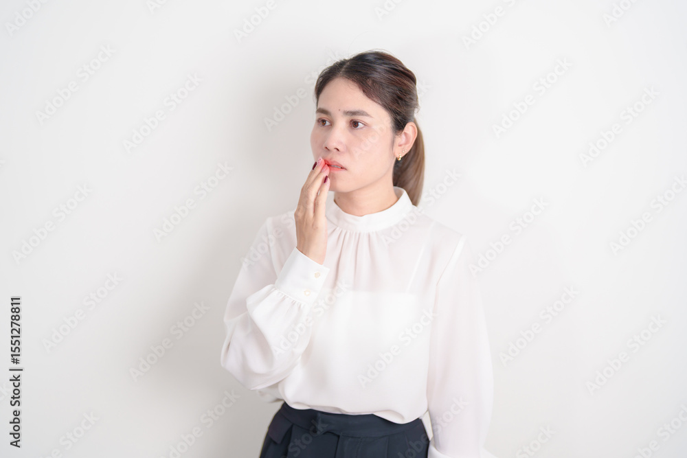 Business woman having Mouth ache for concepts of Mouth Ulcer Sore, Aphthous Stomatitis, Oral Lesions, Halitosis, Oral Health Care, Toothache and Gum Disease, Dental Caries, Gingivitis and Periodontal