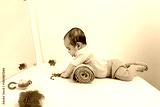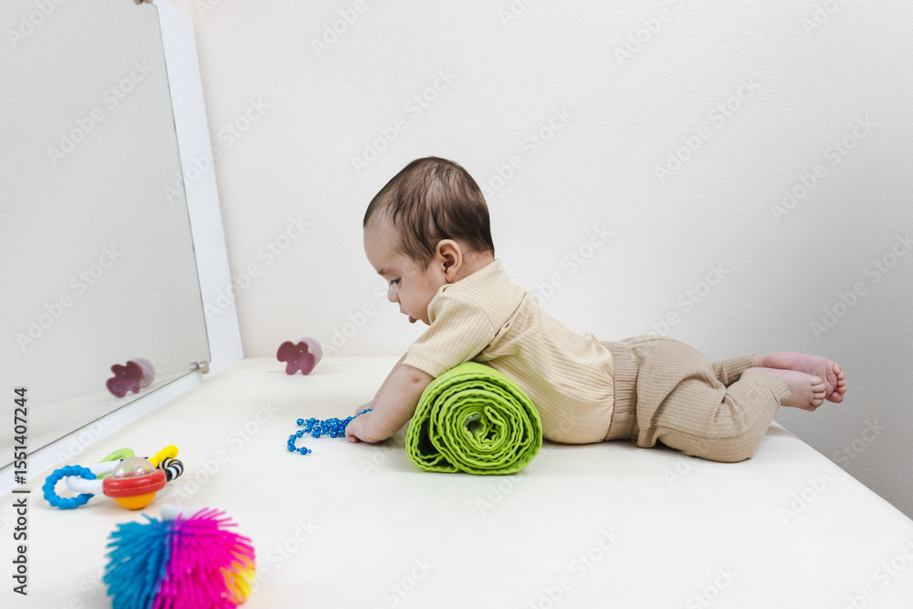 Young child on tummy roll engaging in core-strengthening rehabilitation exercise. Pediatric rehab session