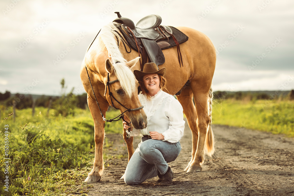 A woman, proudly wearing a cowboy hat, stands next to her horse