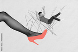 Full 3d poster art pop collage of scared man fly female leg wear high heel empowerment boss sexism abuse breakup relationship