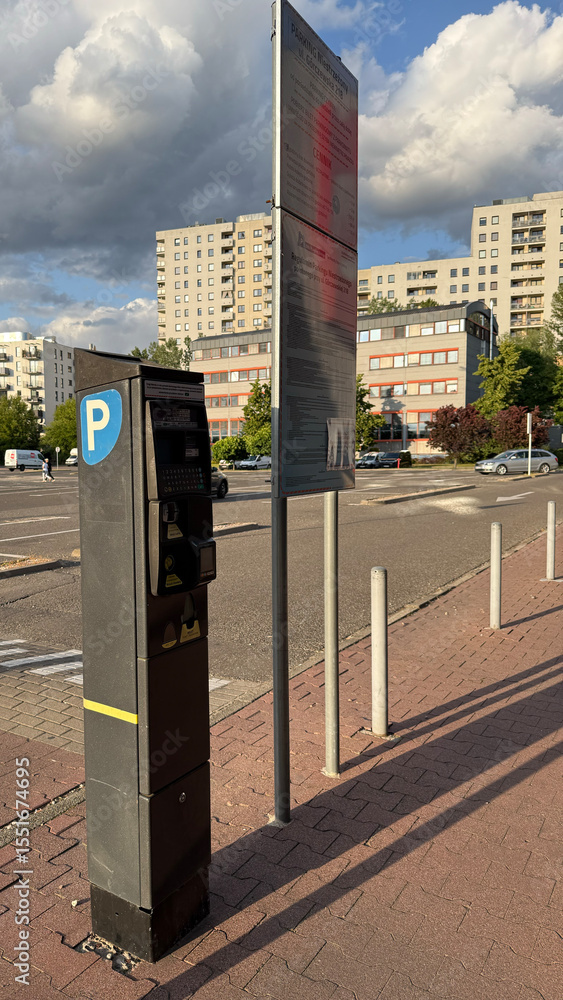 Warsaw, Poland - June 19, 2025: Parking meter with sign in urban area surrounded by residential buildings