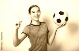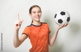 one caucasian young soccer player girl standing in studio gray background