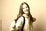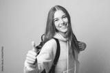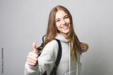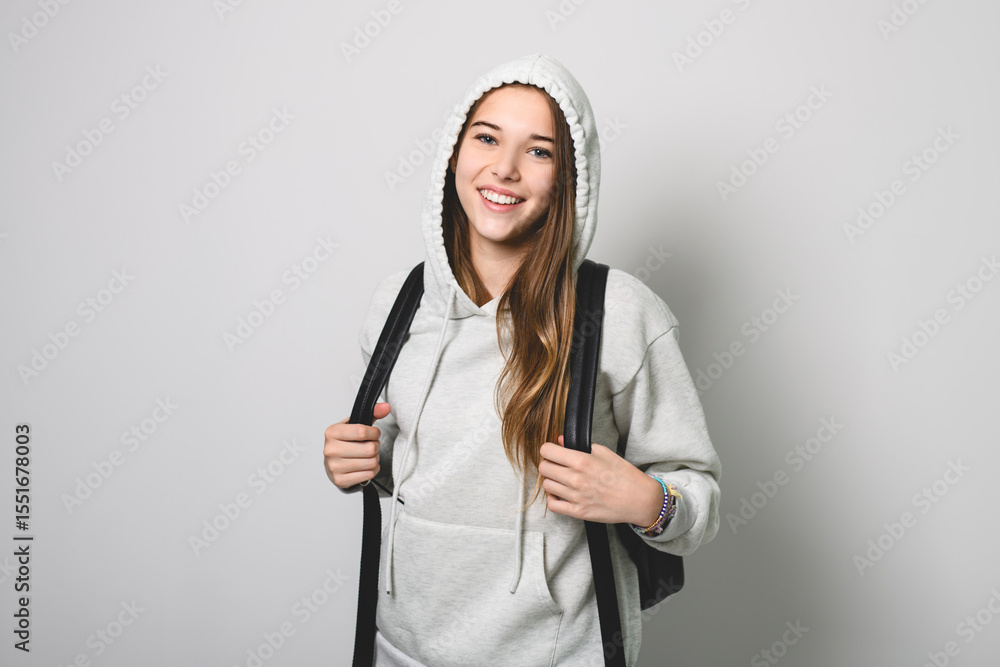 Portrait of teenage student girl in casual t-shirt on light background in studio.