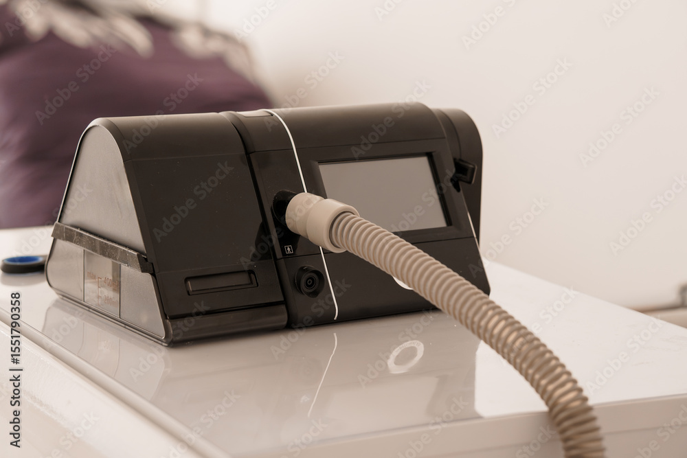 Modern Black CPAP APAP Humidifier on White Nightstand. Healthcare Device for Sleep Apnea Therapy. Medical Equipment, Bedroom, Purple Accents