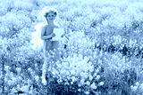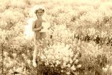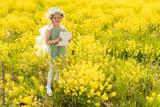 Wide shot portrait of imaginative child girl in fairy attire and floral headpiece posing with blank canvas amid golden wildflower meadow, sunlight illuminating scene, smiling looking at camera.