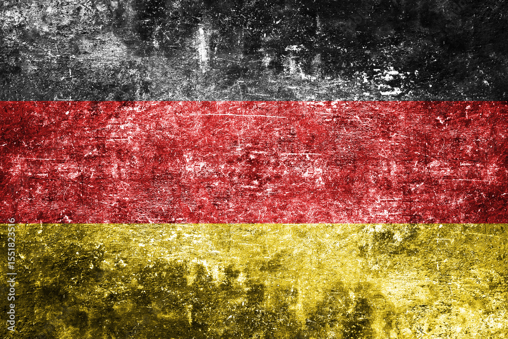 Grunge style German flag. Weathered black red gold colors. Worn national symbol texture. Distressed patriotic background. Germany identity concept. Rough vintage surface for design and posters.