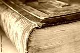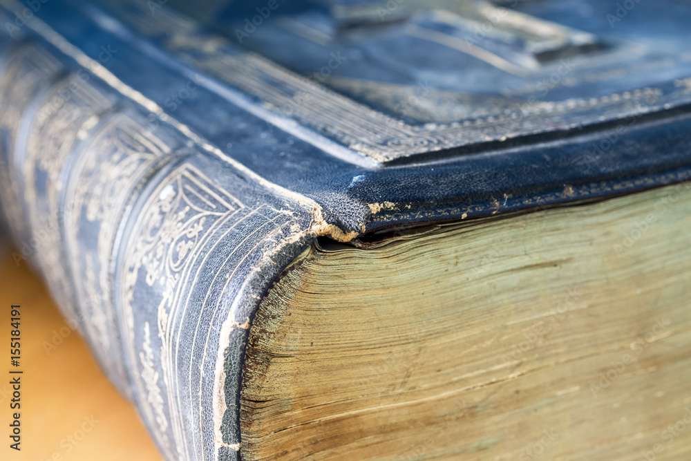 Closeup of beautiful old antique bible book, faded and worn